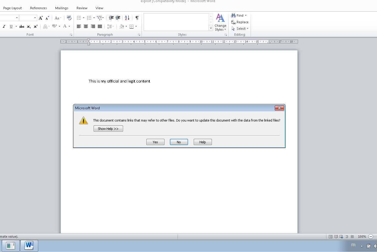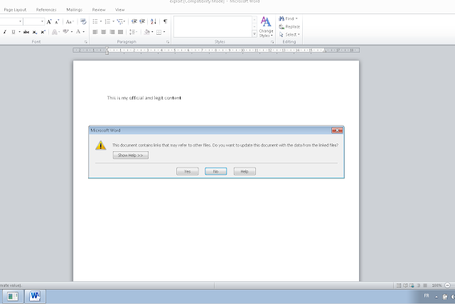 At this step, if the user opens the "exploit.rtf" file he will have to double click on the link object to launch the attack...