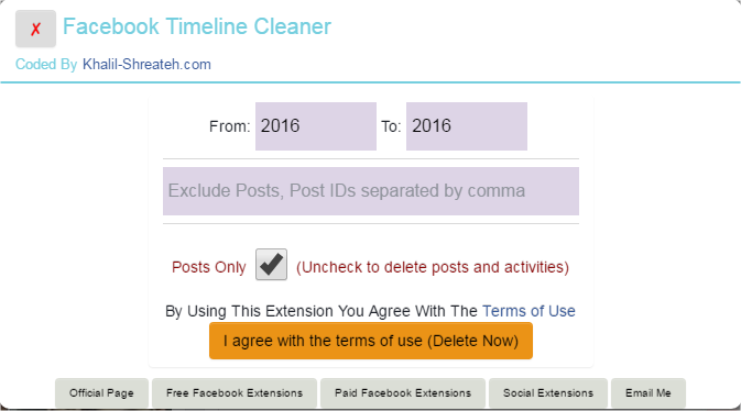 2- Type from what year to what year you want the extenion to delete your posts between, default years will delete all your account posts. Example if you want to delete your 2010 and 2011 years posts, type 2010 in "from" field and 2011 in "to" field.