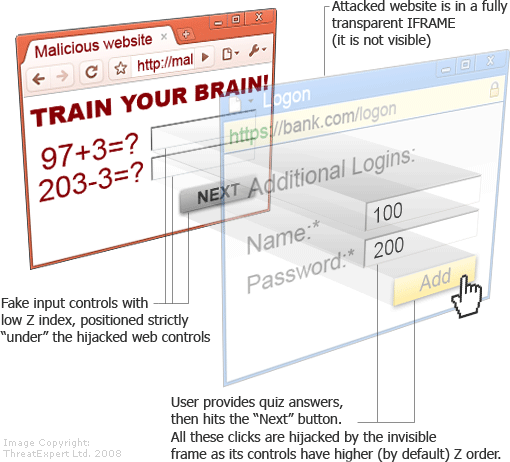 Spammers sometimes take advantage of a vulnerability in the web browser to try to trick people into clicking on links they might not want to click on. This is called clickjacking, and it’s done by overlaying the link with something more enticing, like a phony offer.